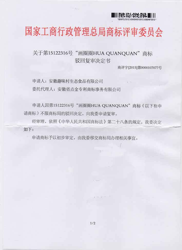 第15122316号“画圈圈HUA QUANQUAN”商标驳回复审决定书
