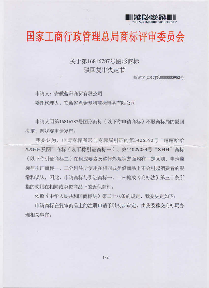 第16816787号“嘻嘻哈哈XXHH”驳回复审成功