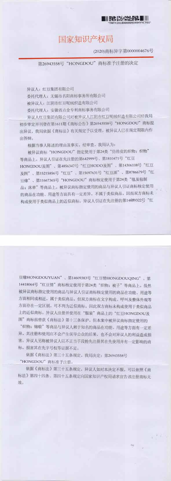 第26943558号“HONGDOU”异议答辩成功