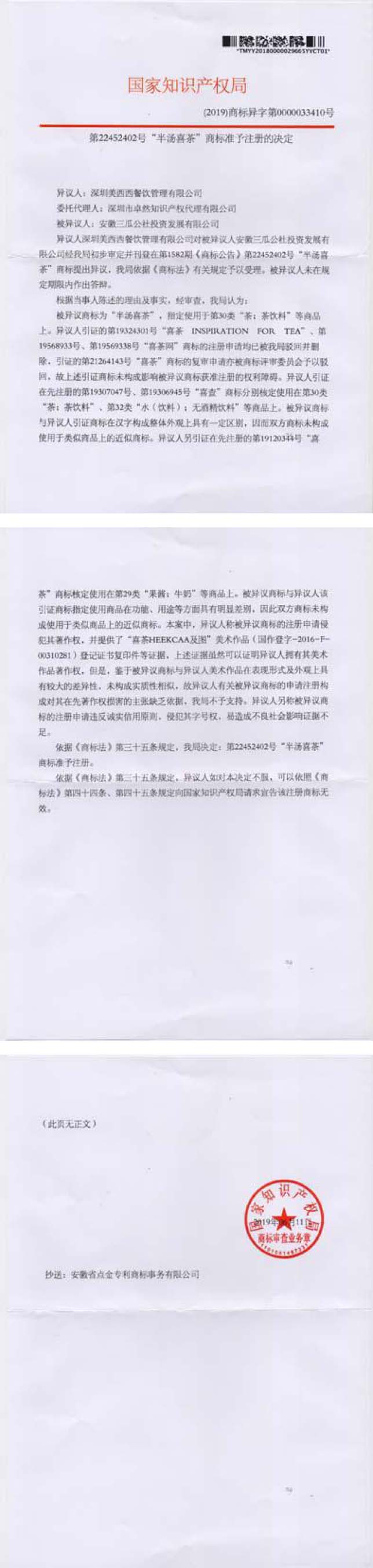 第22452402号“半汤喜茶”异议答辩成功