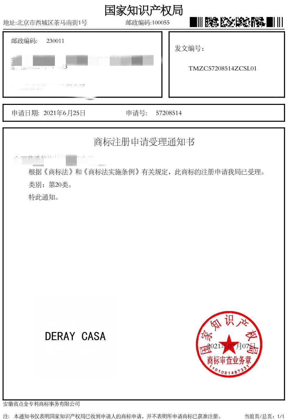 第7类“DERAY CASA”受理通知书
