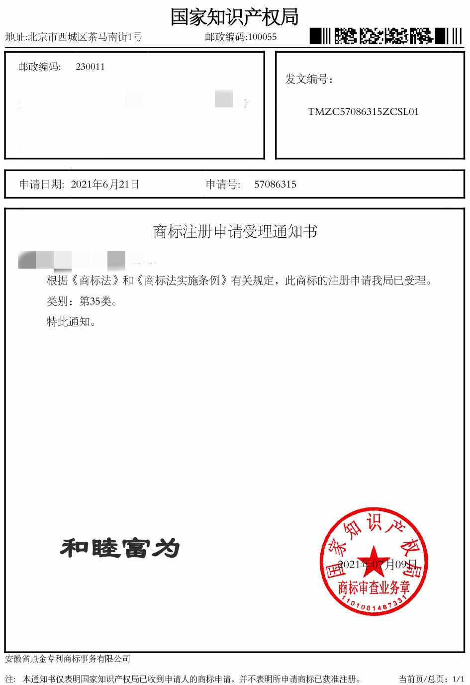 第35类“和睦富为”商标受理通知书