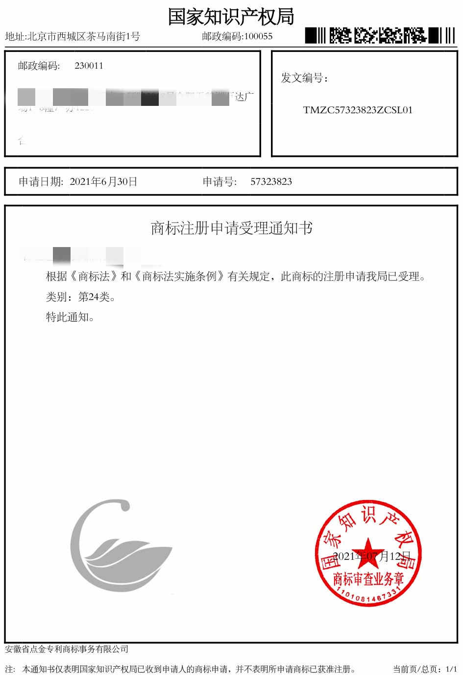 第24类“图形”商标受理通知书