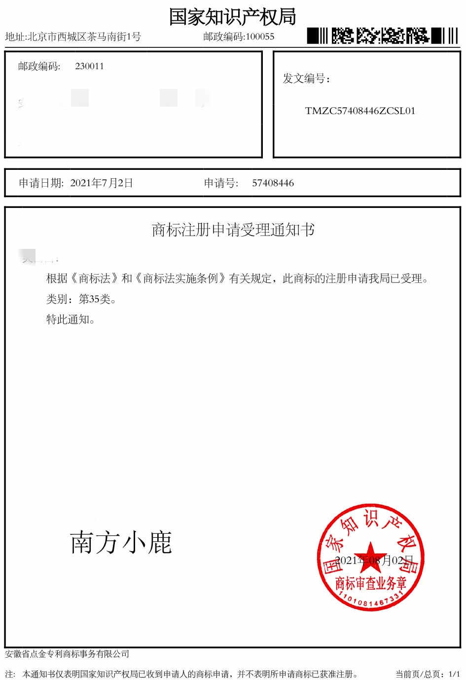 第35类“南方小鹿”商标受理通知书