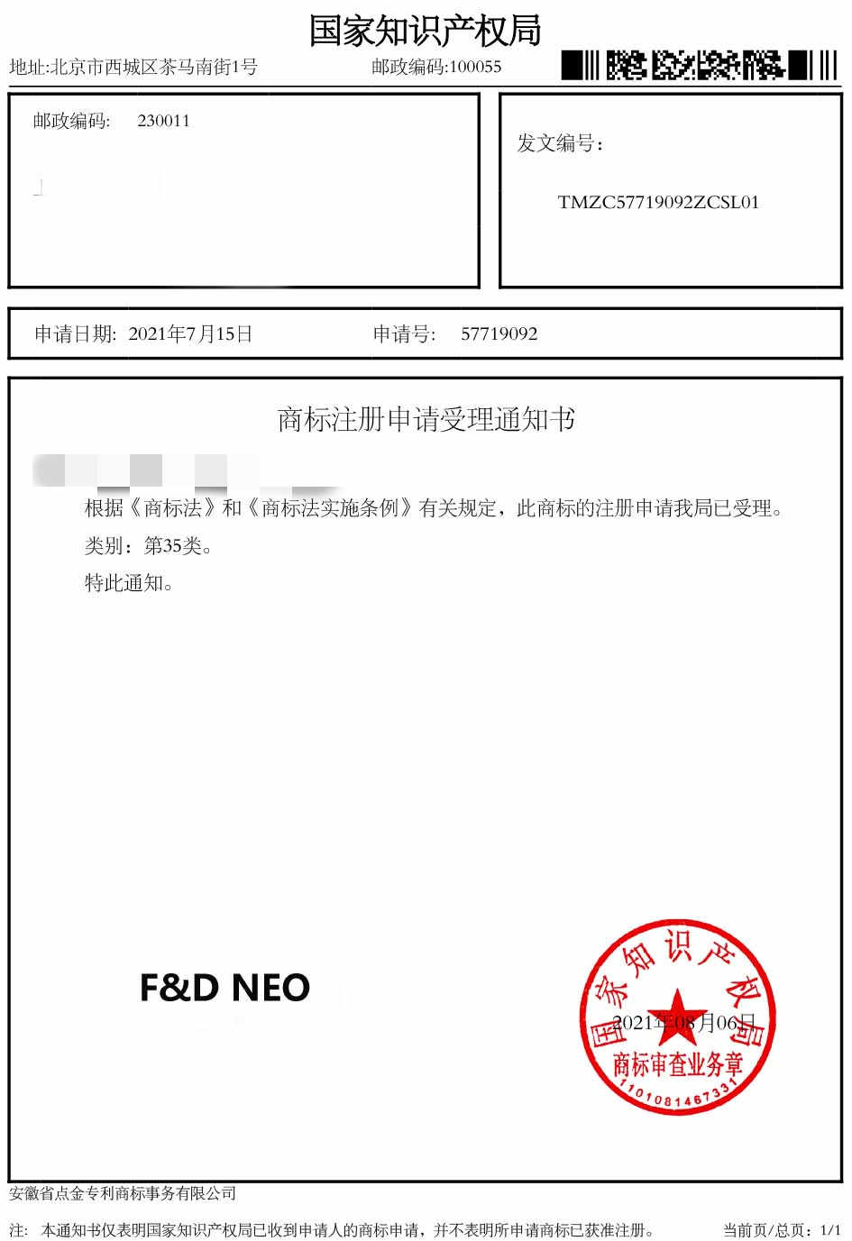 第35类“FD NEO”商标受理通知书