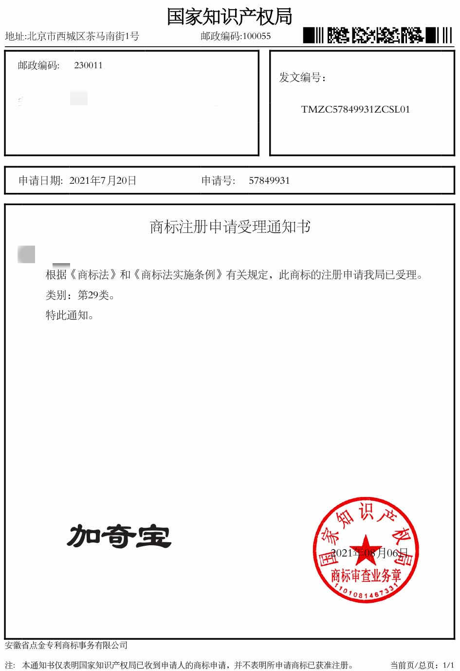 第29类“加奇宝”商标受理通知书
