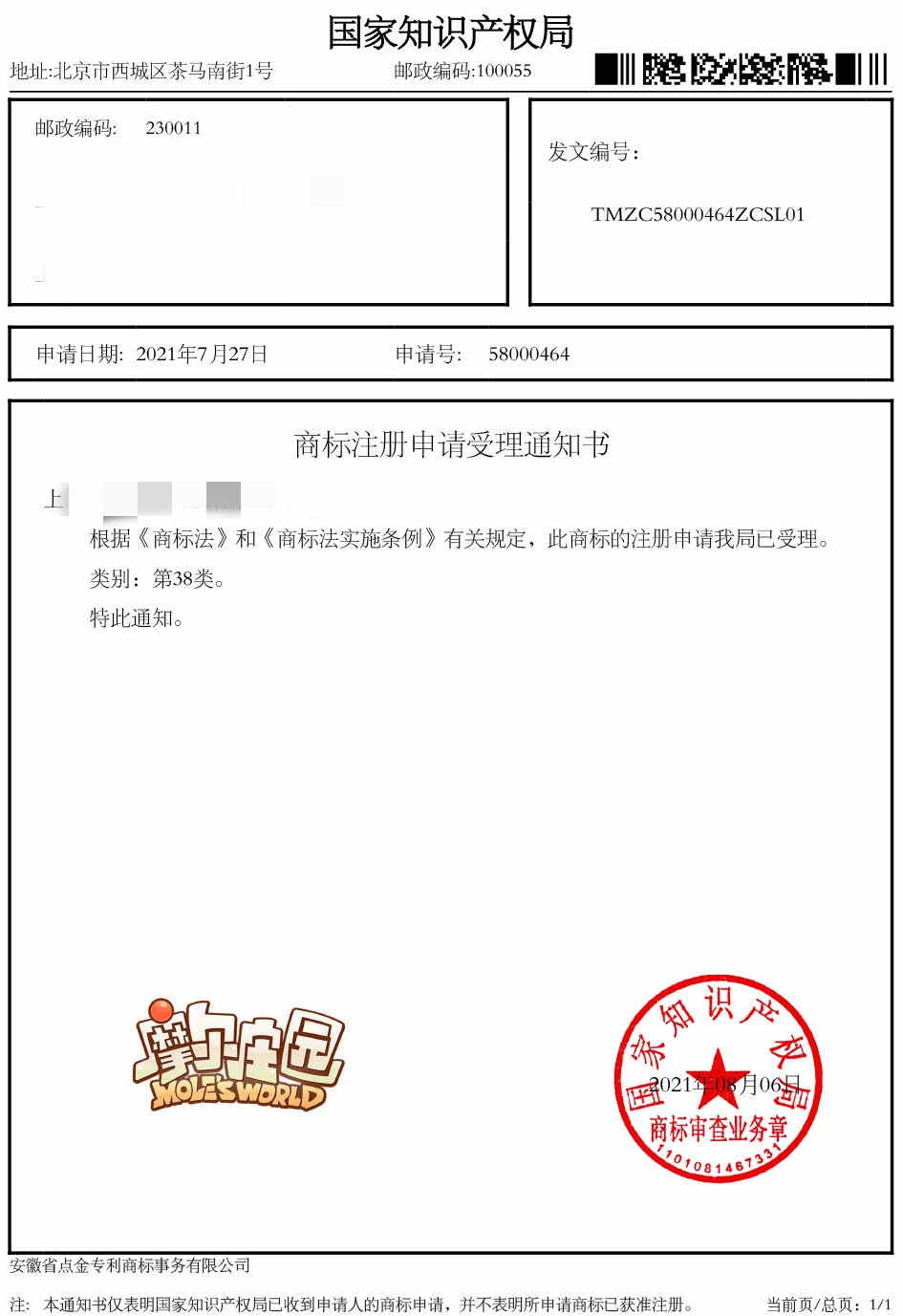 第38类“摩尔庄园”商标受理通知书