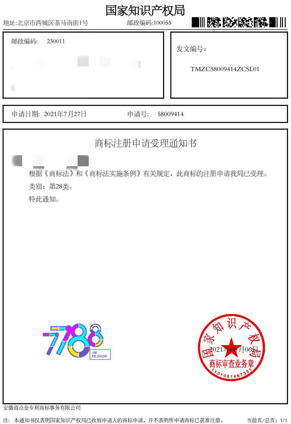 第28类“7788 IN FR SHOP”商标受理通知书
