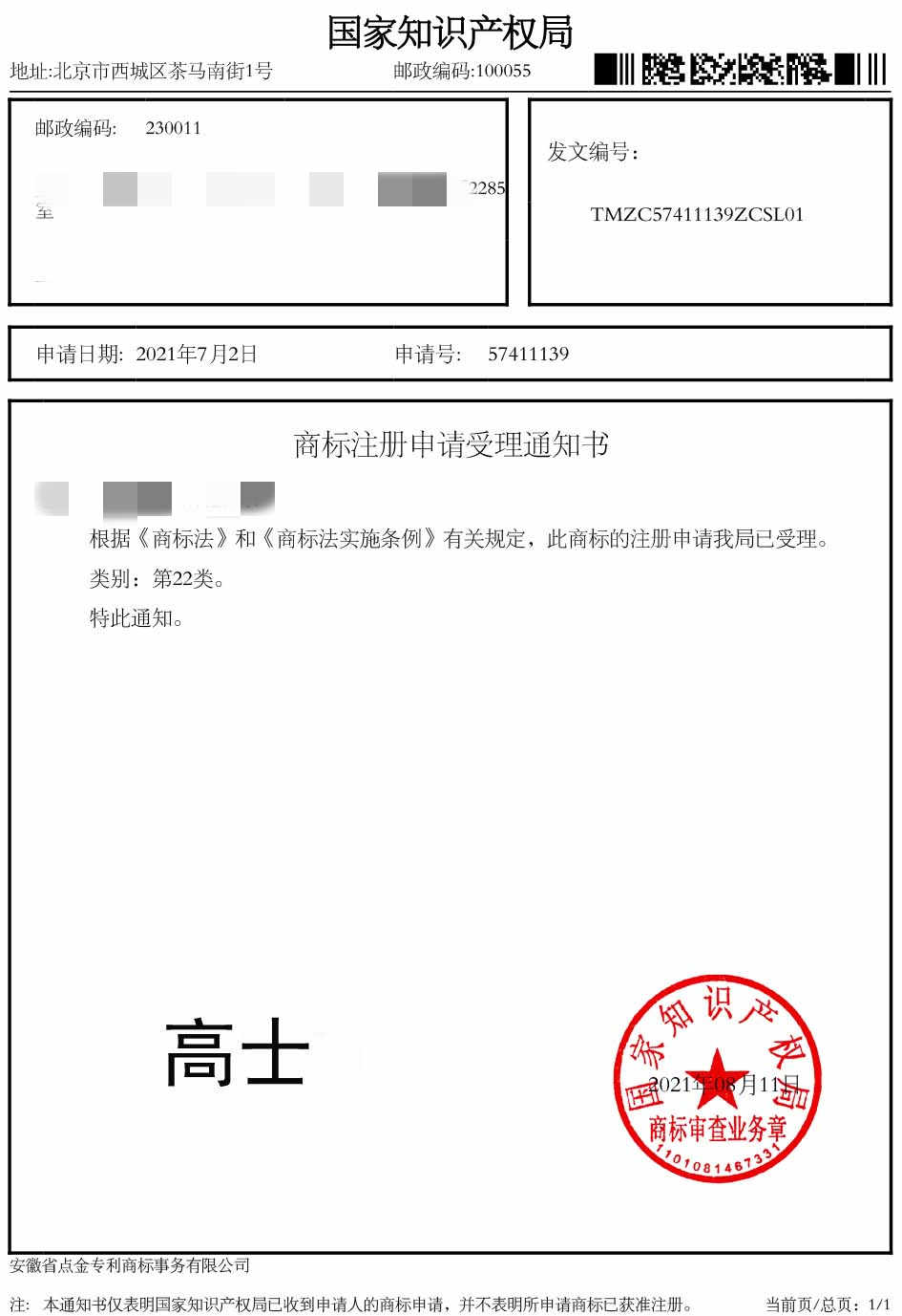 第22类“高士”商标受理通知书