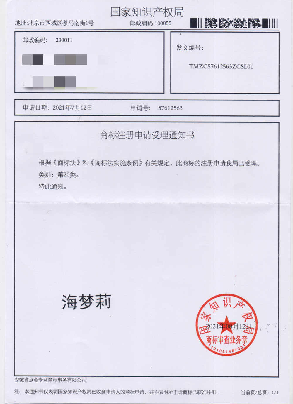 第20类“海梦莉”商标受理通知书
