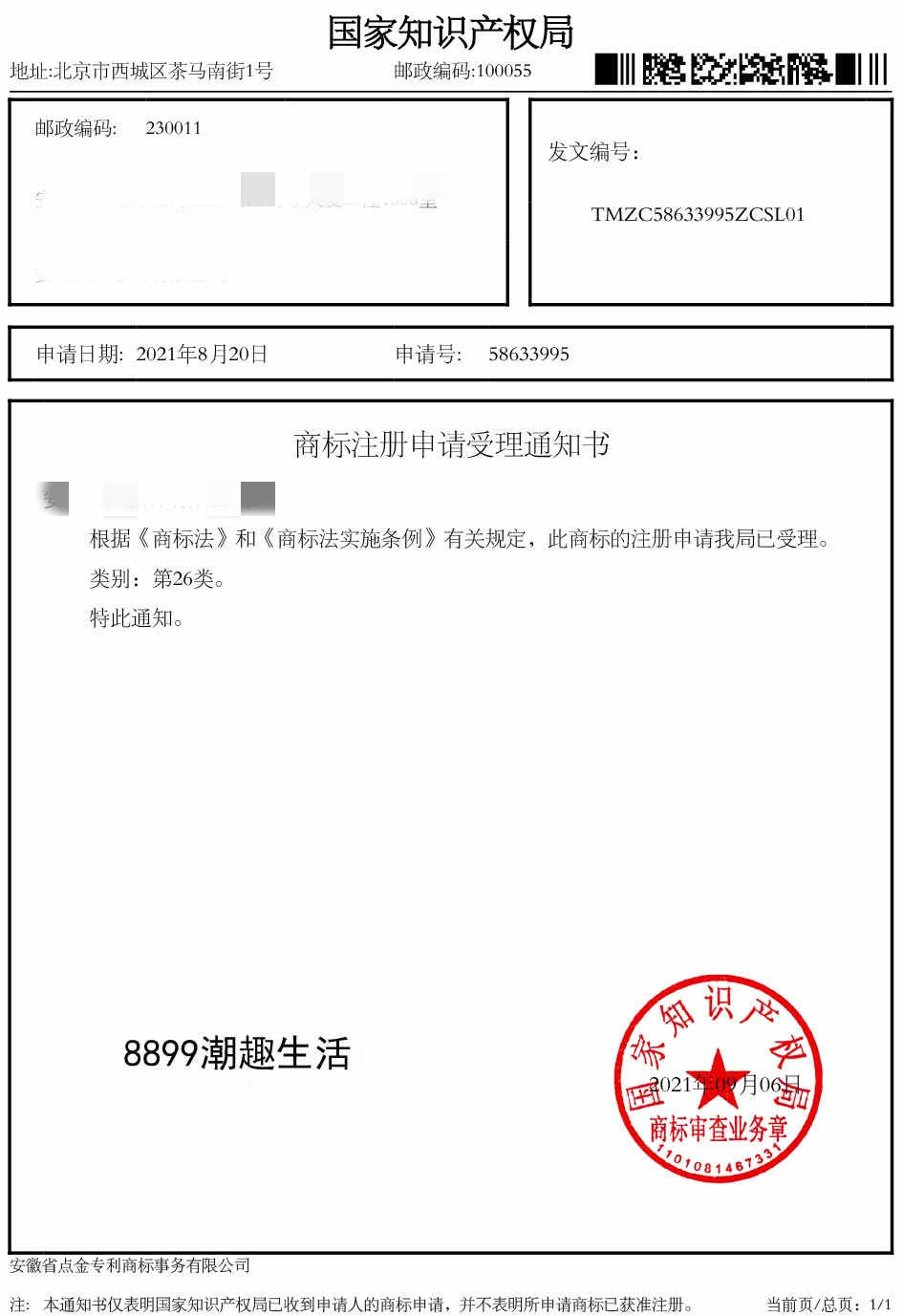 第26类“6699 潮趣生活”商标受理通知书