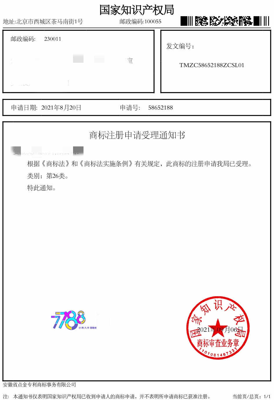 第26类“7788 小物大作 潮趣地”商标受理通知书