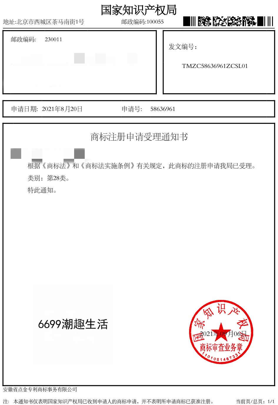 第28类“6699 潮趣生活”商标受理通知书