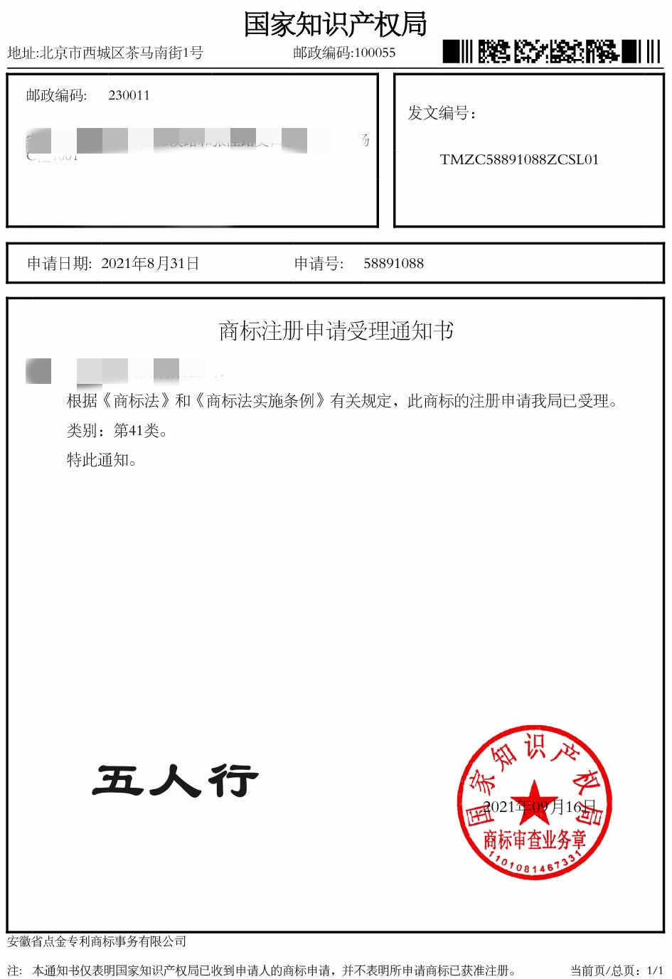 第41类“五人行”商标受理通知书