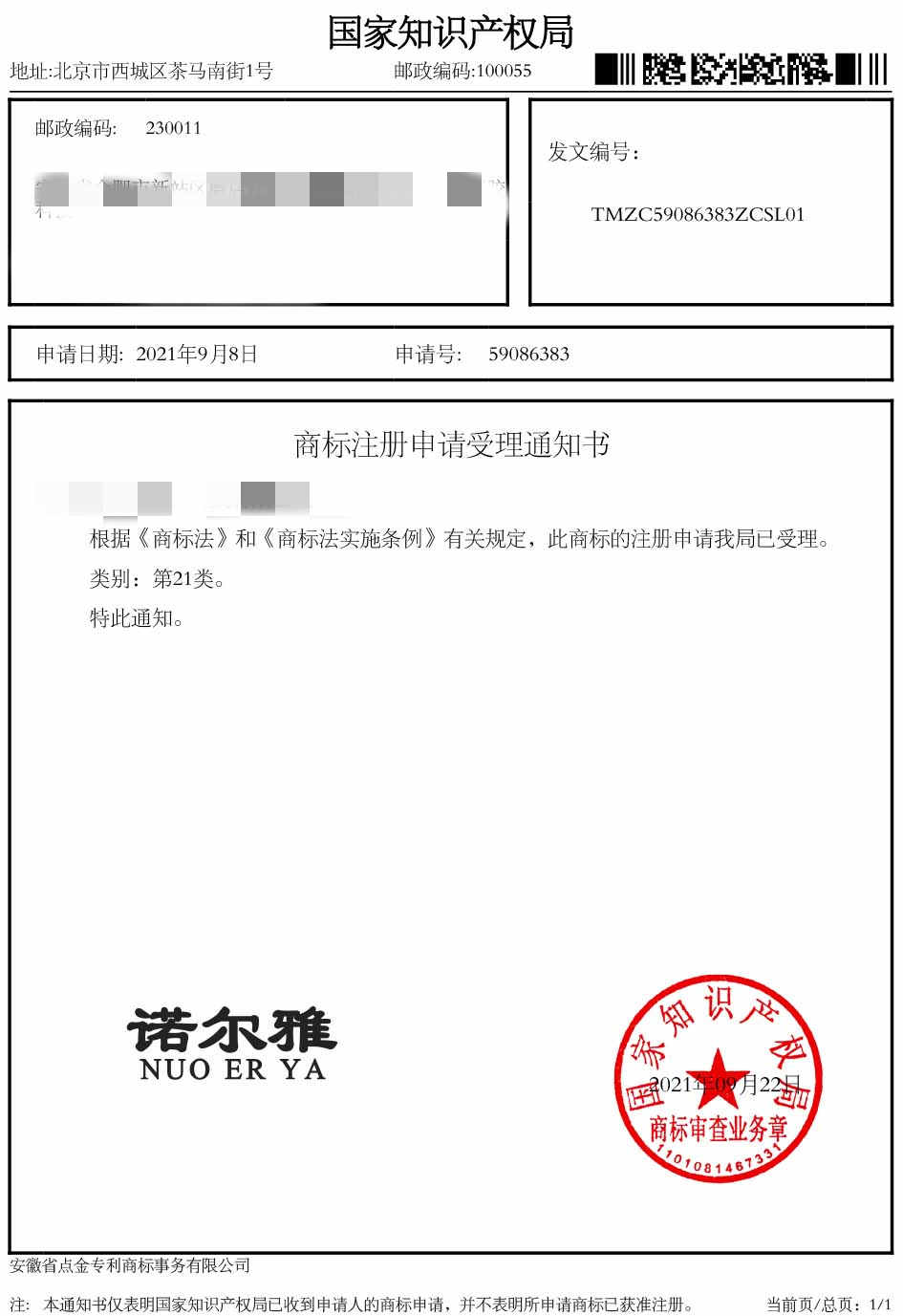 第21类“诺尔雅”商标受理通知书