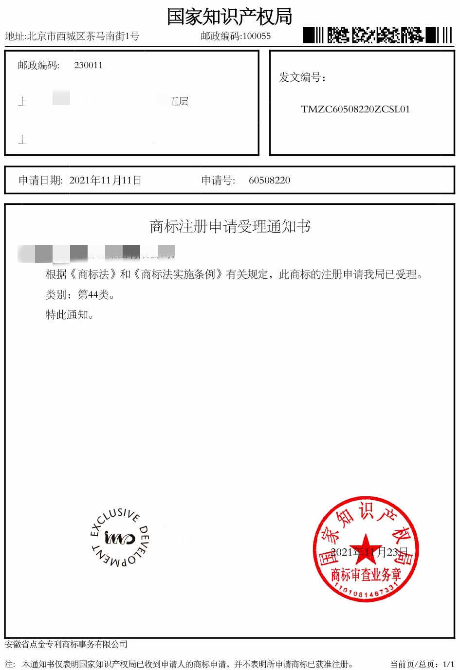 第44类“EXCLUSIVE DEVELOPMENT”商标受理通知书