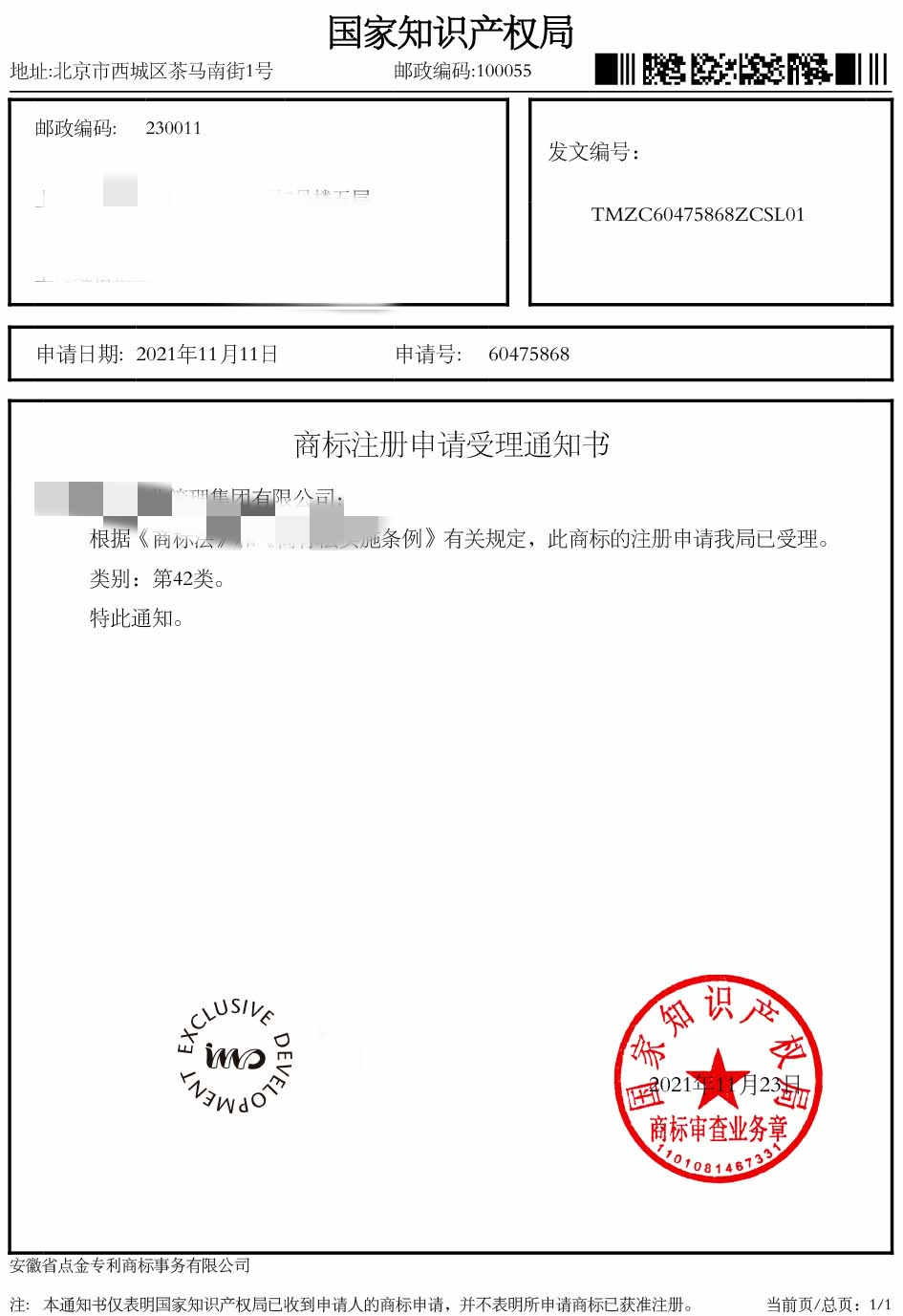 第42类“EXCLUSIVE DEVELOPMENT”商标受理通知书