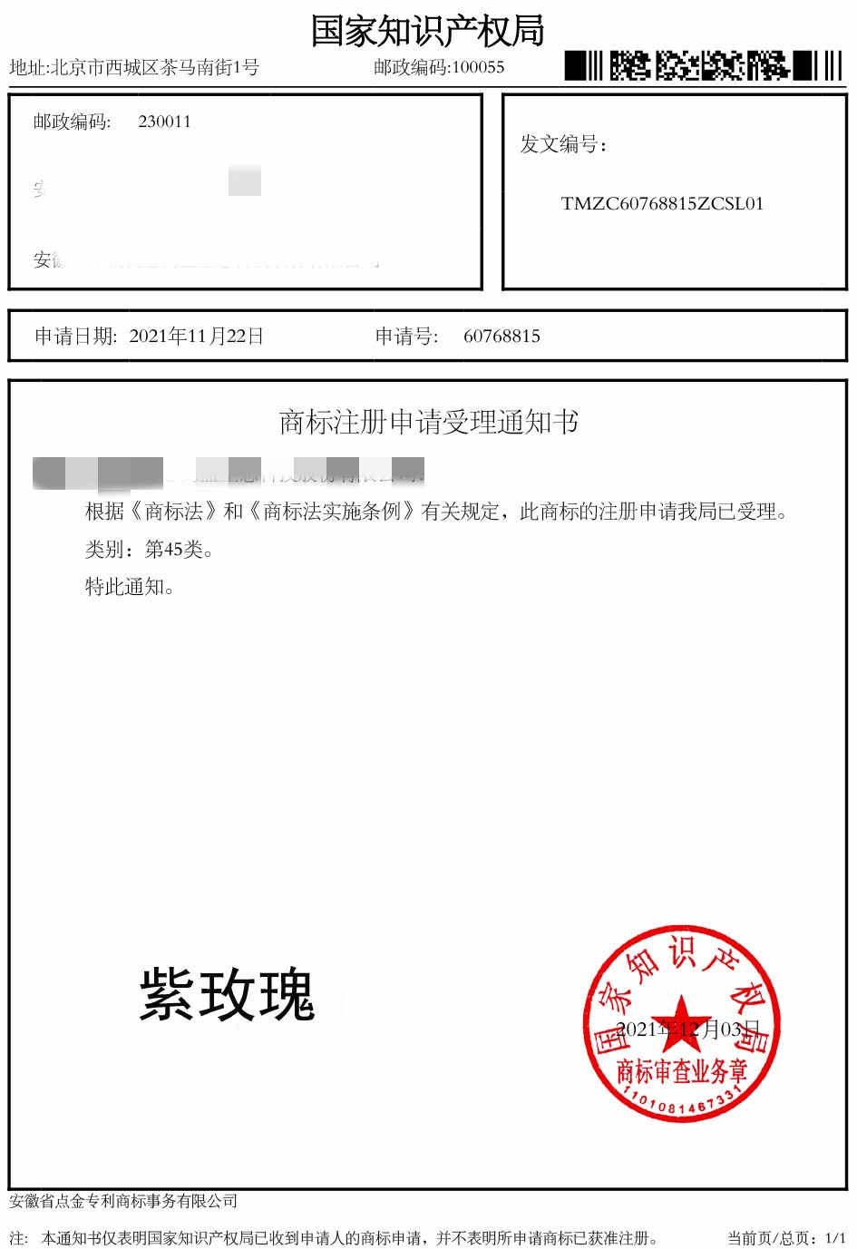第45类“紫玫瑰”商标受理通知书