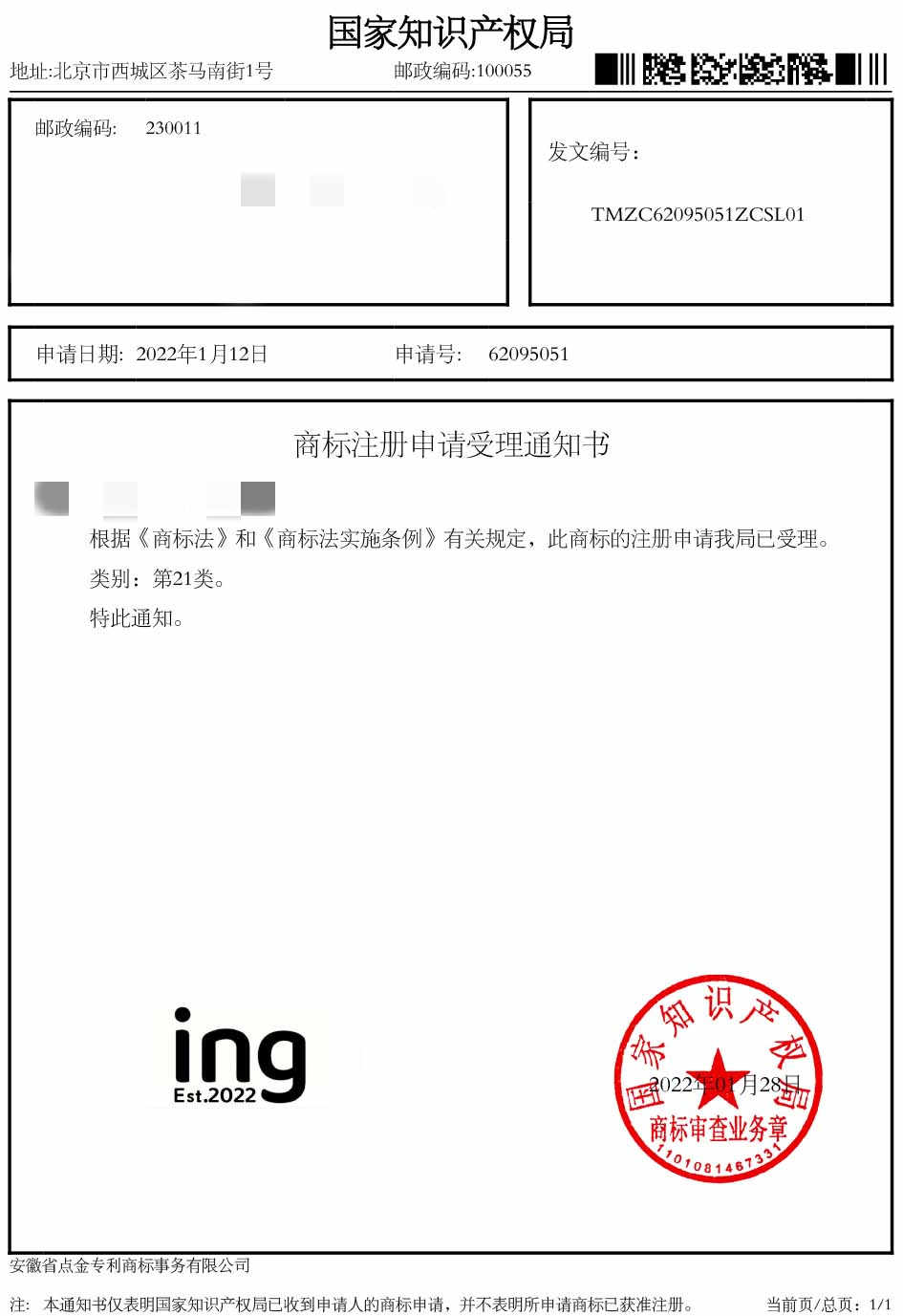 第21类“ING EST”商标受理通知书