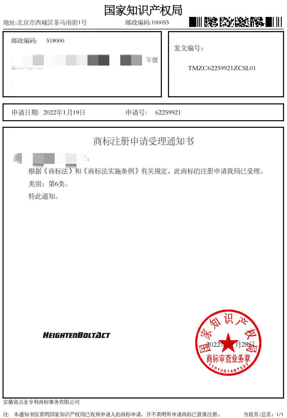 第6类“HEIGHTENBOLTACT”商标受理通知书