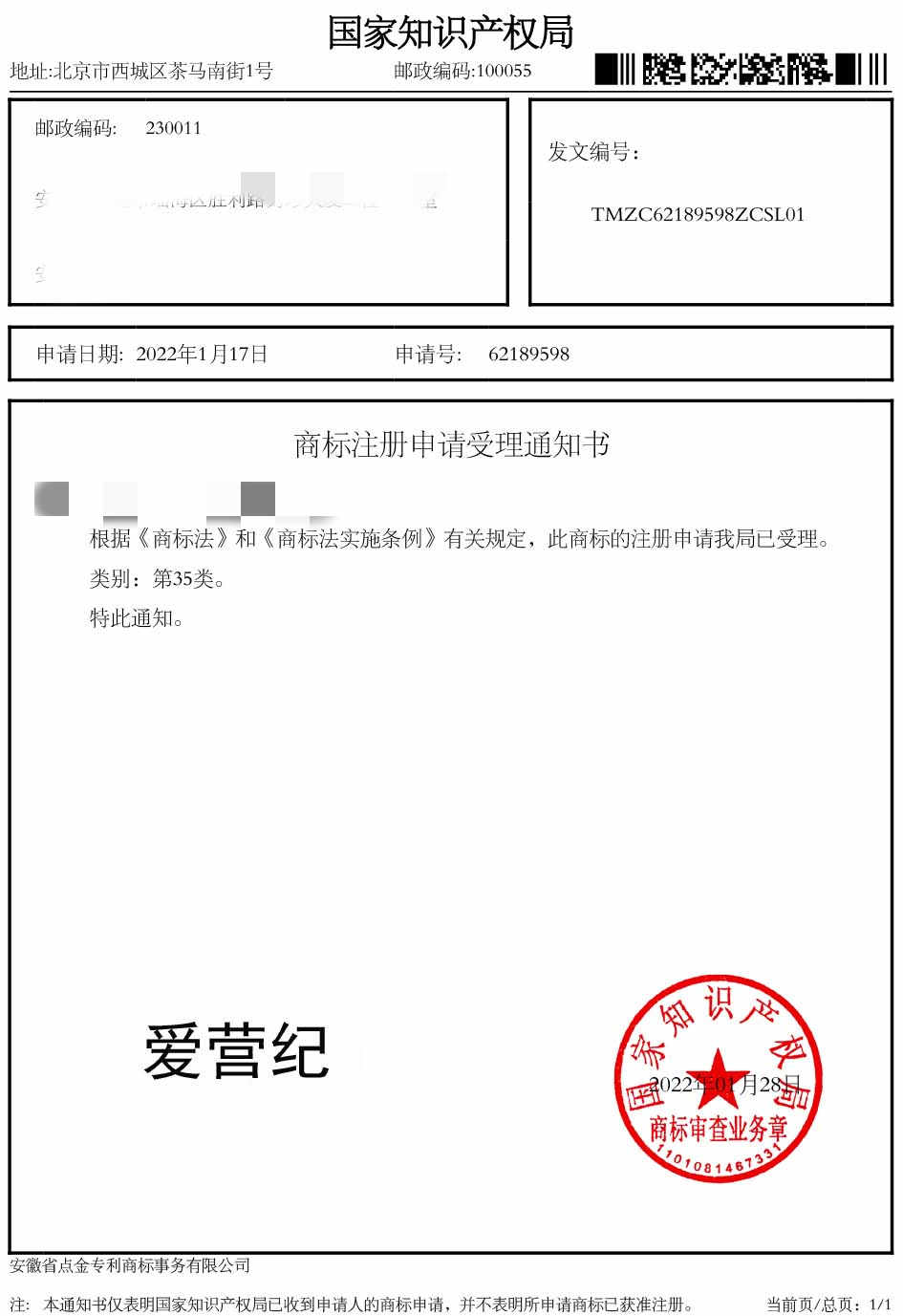 第35类“爱营纪”商标受理通知书