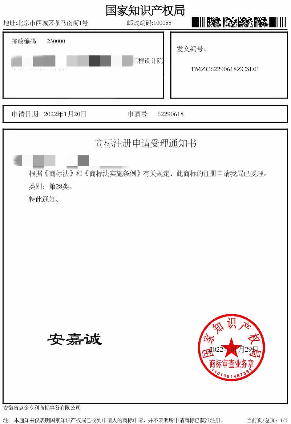 第28类“安嘉诚”商标受理通知书