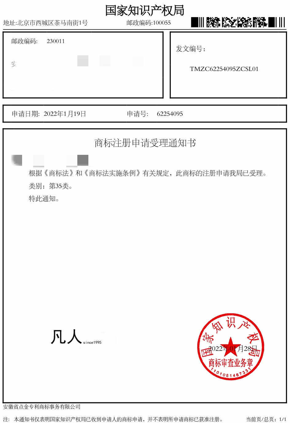 第35类“凡人SINCE 1995”商标受理通知书