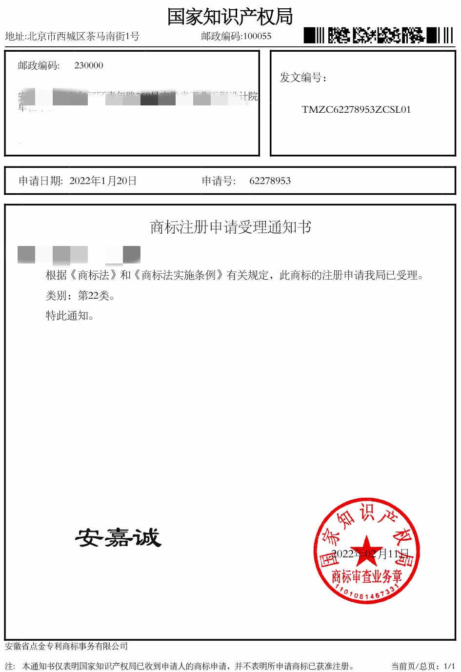 第22类“安嘉诚”商标受理通知书