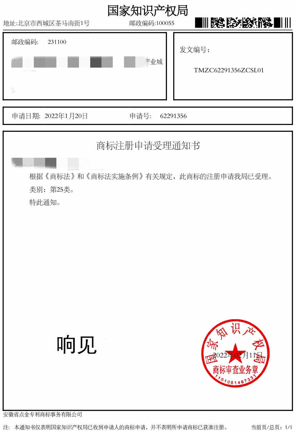 第25类“响见”商标受理通知书