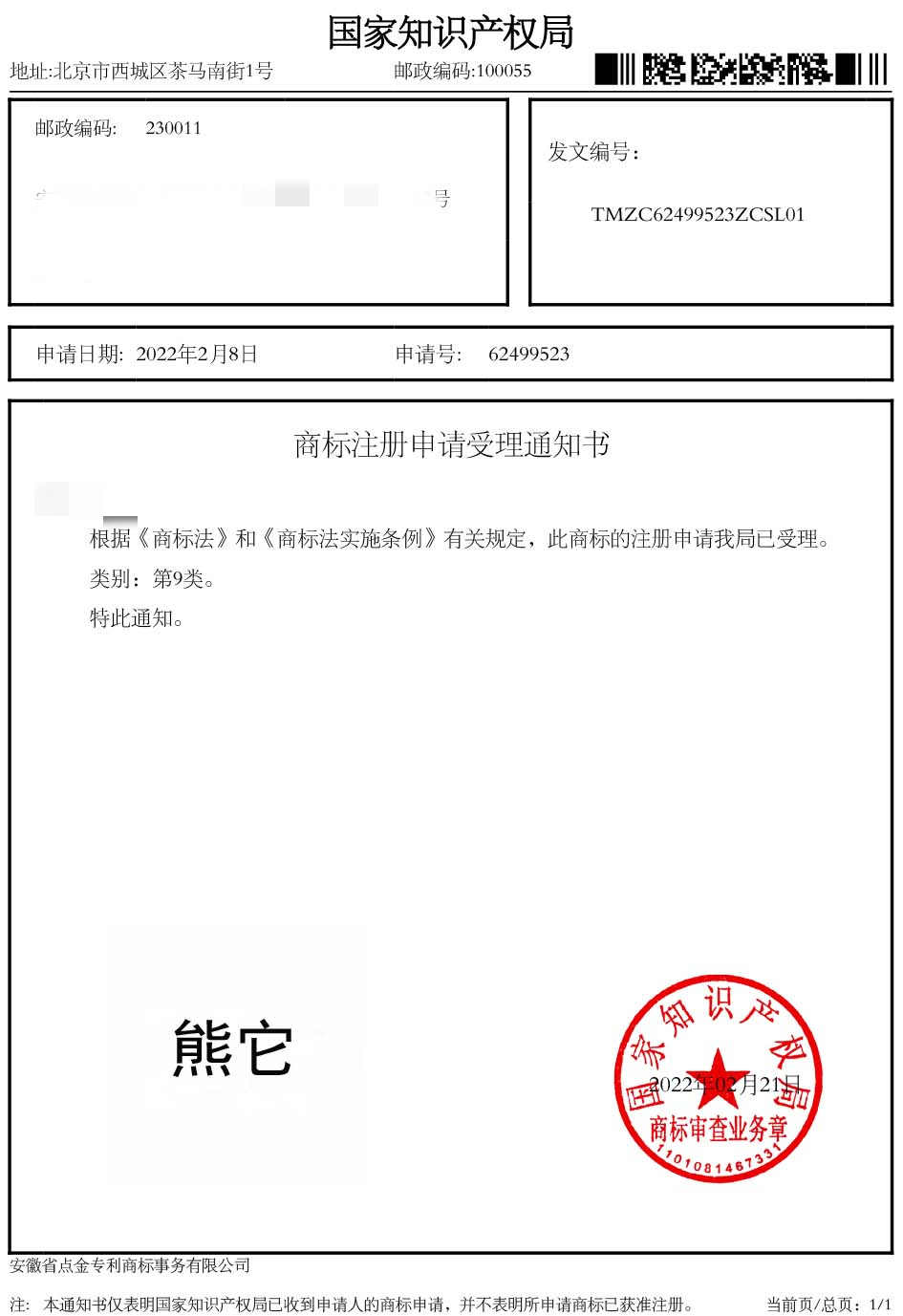 第9类“熊它”商标受理通知书