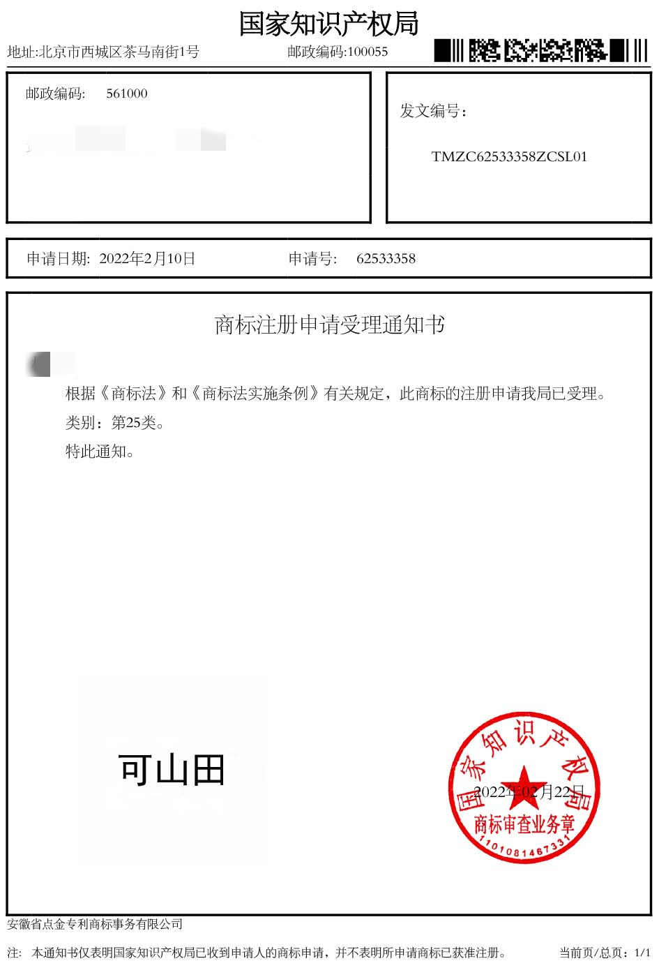 第25类“可山田”商标受理通知书
