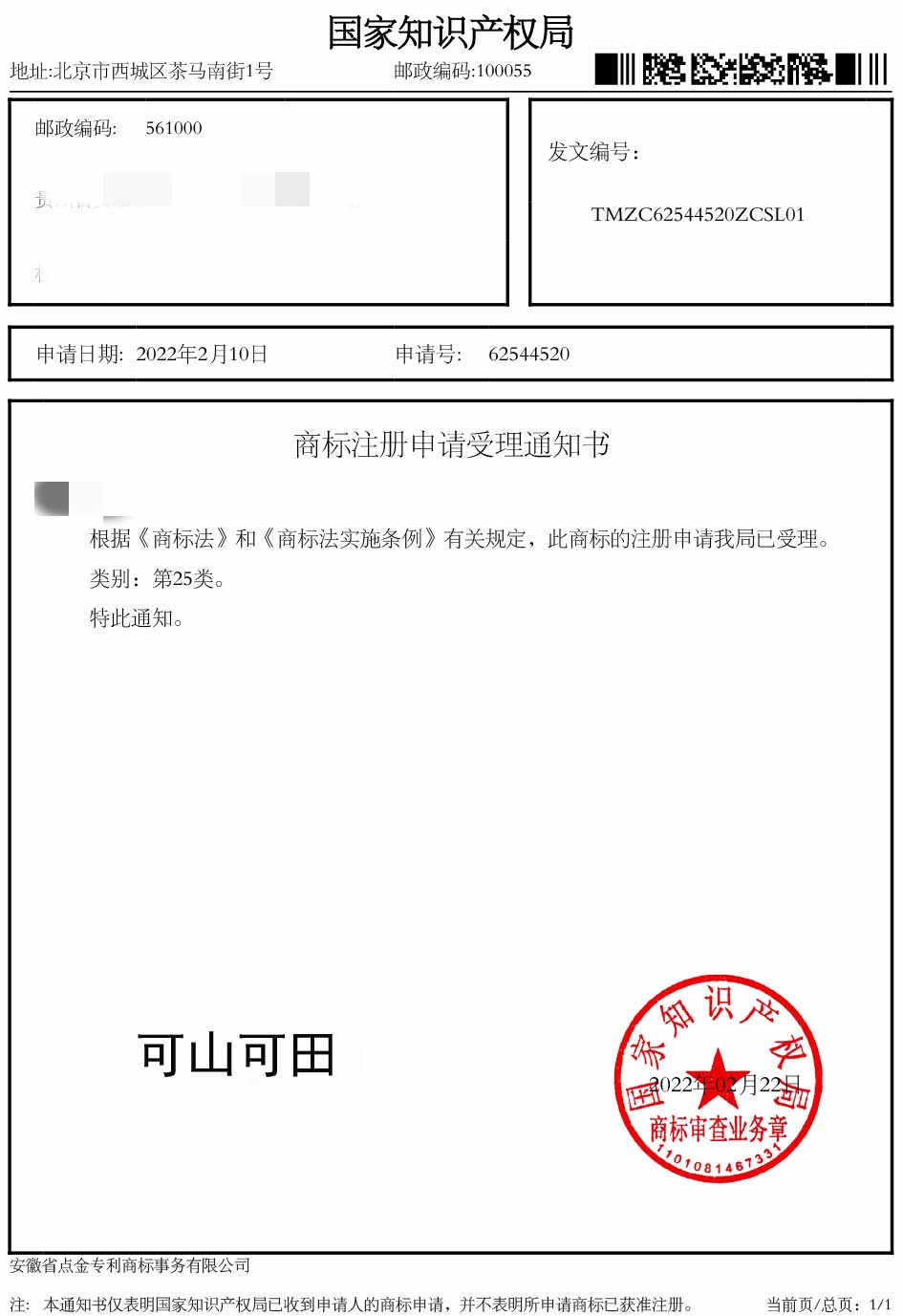 第25类“可山可田”商标受理通知书