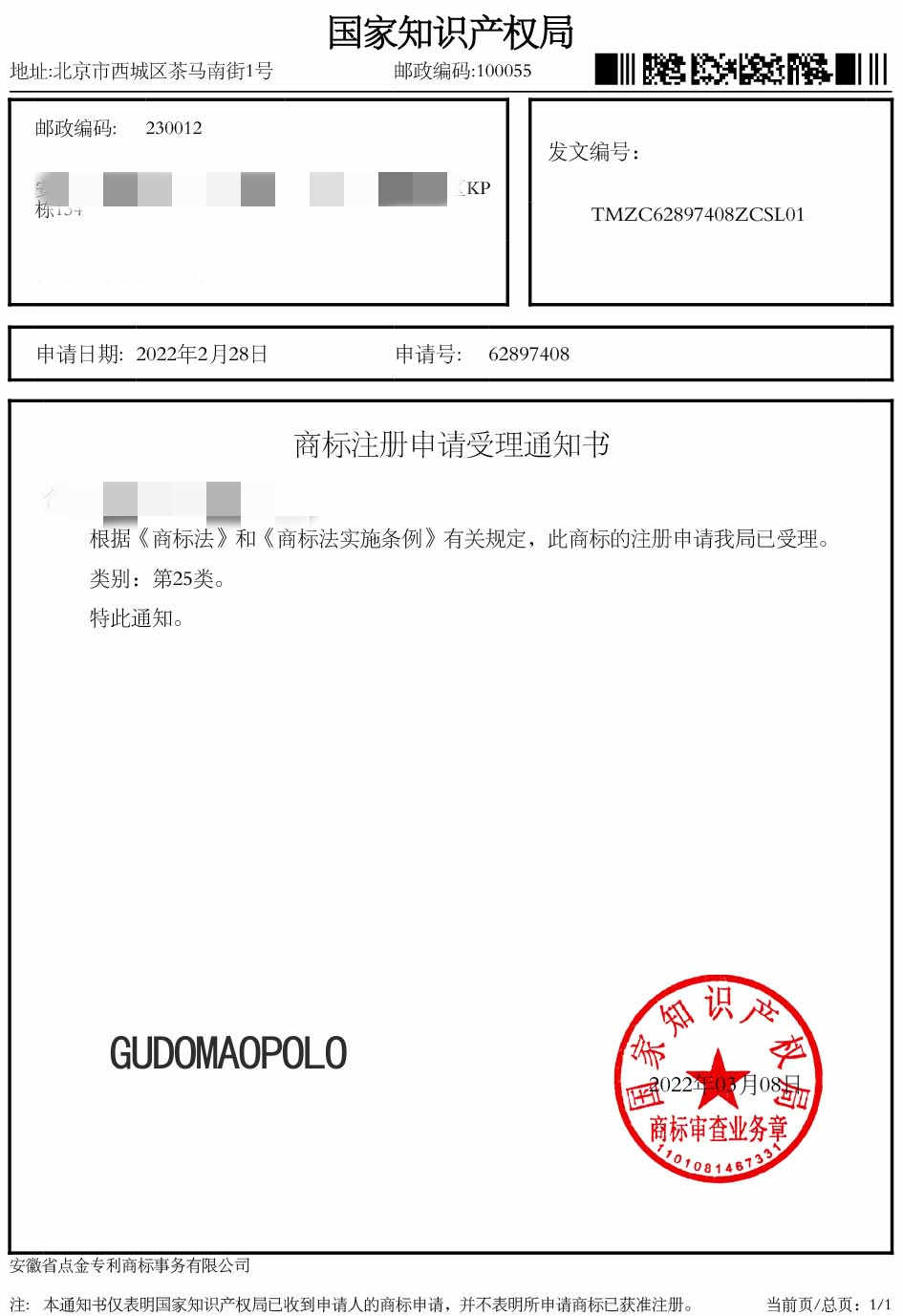 第25类“GUDOMAOPOLO”商标受理通知书
