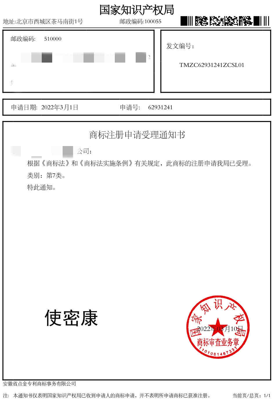 第7类“使密康”商标受理通知书