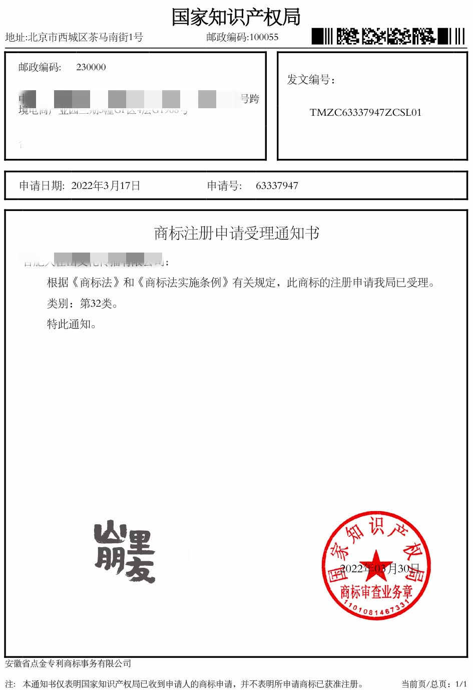 第32类“山里朋友”商标受理通知书