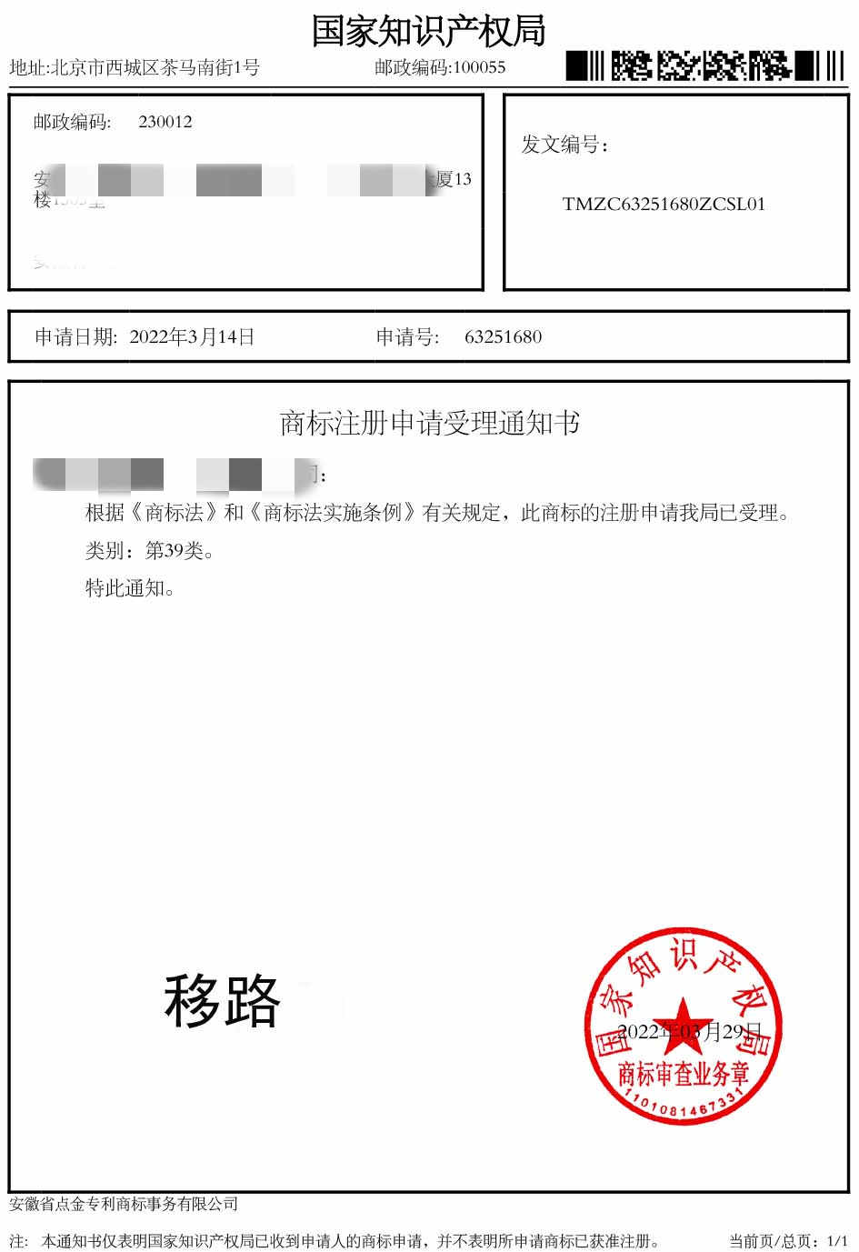 第39类“移路”商标受理通知书