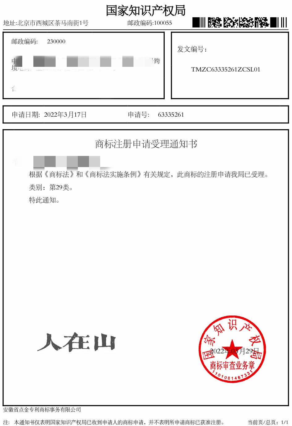 第29类“人在山”商标受理通知书