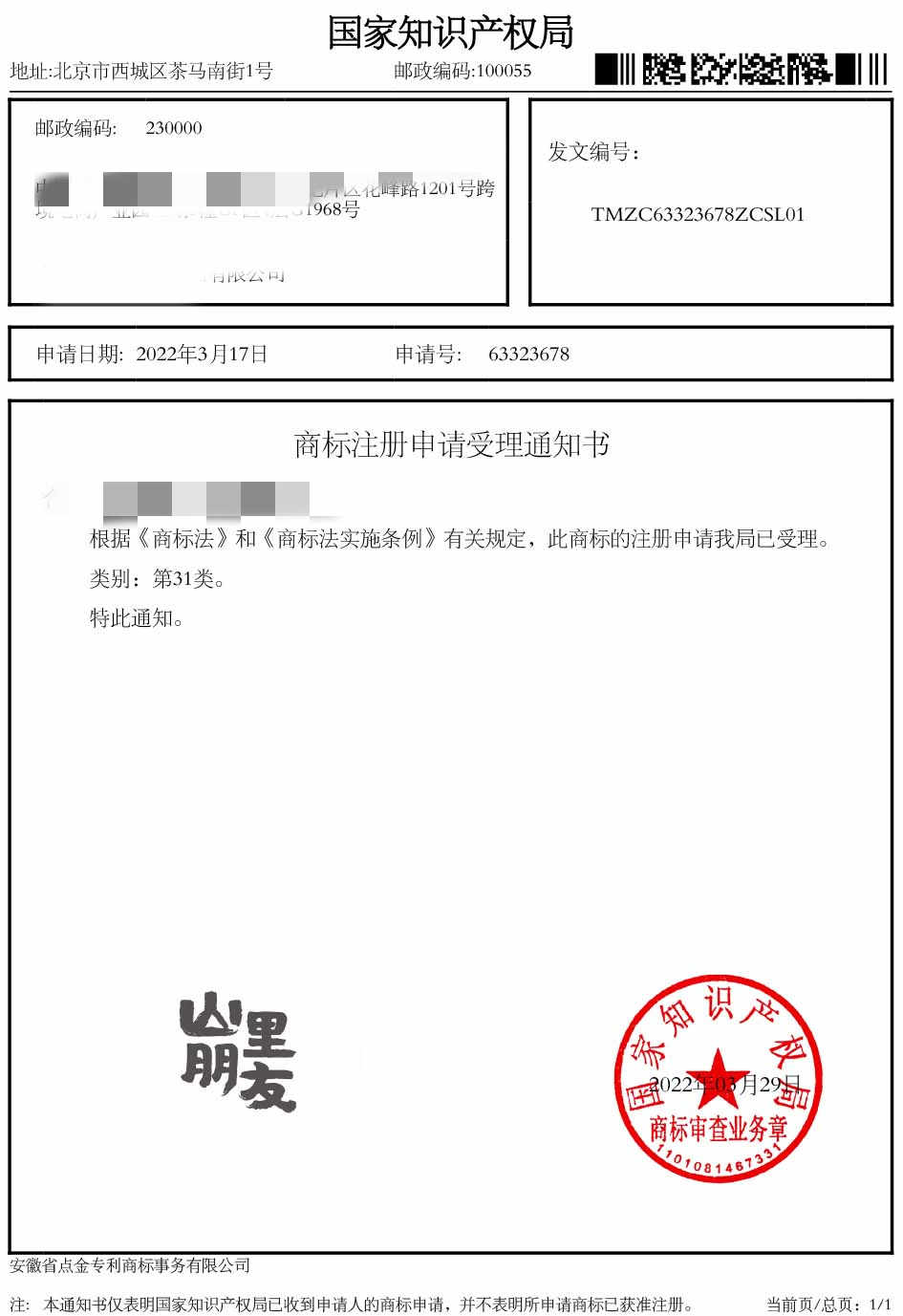 第31类“山里朋友”商标受理通知书