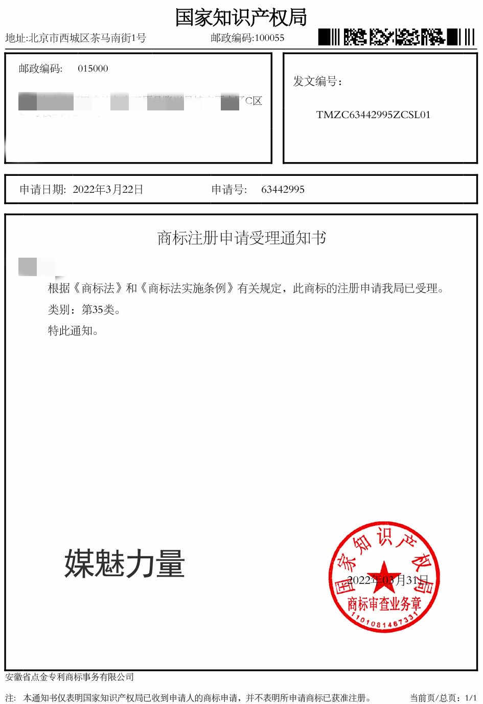 第35类“媒魅力量”商标受理通知书