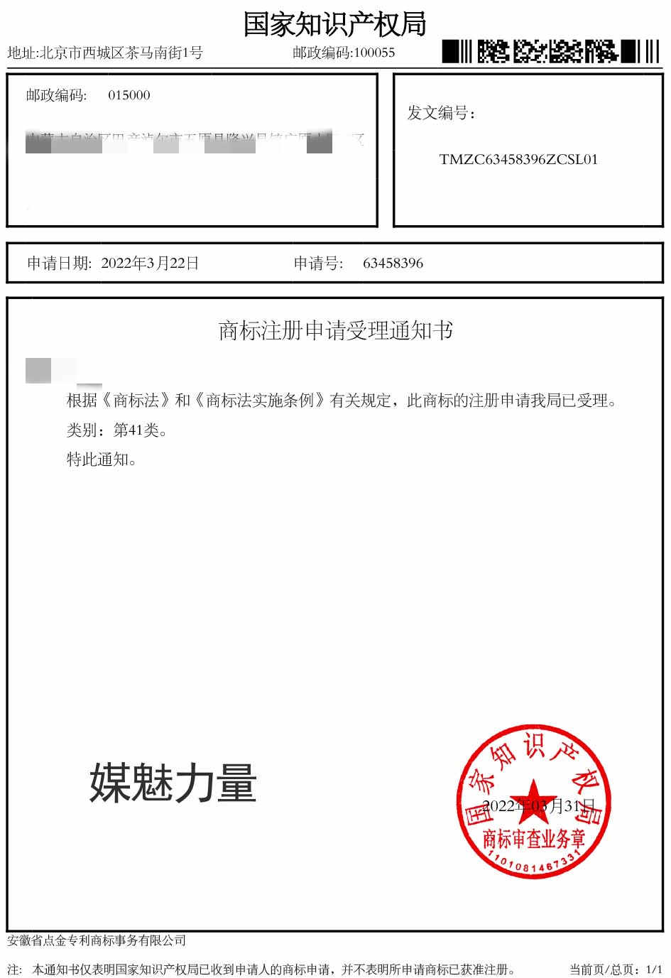 第41类“媒魅力量”商标受理通知书