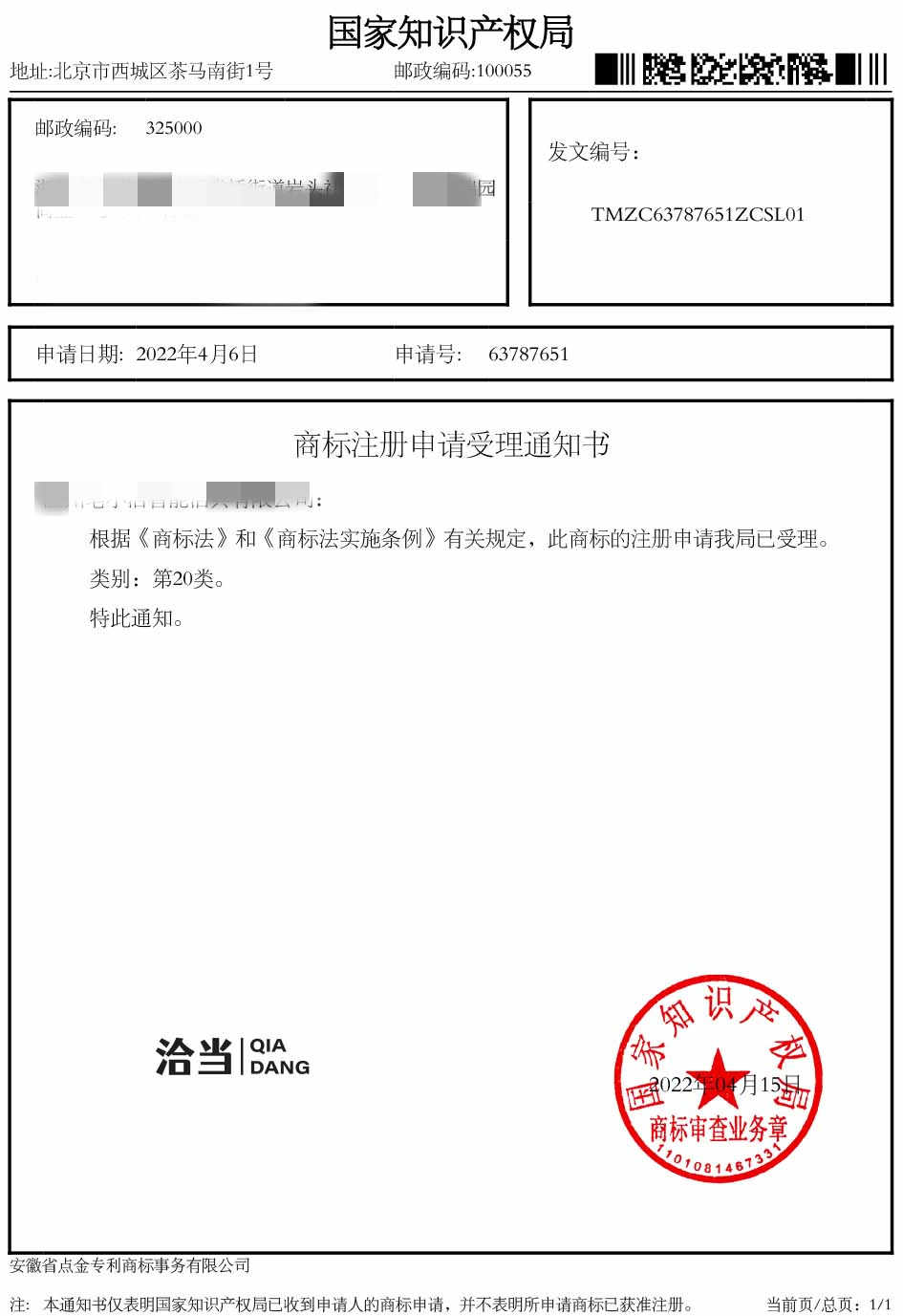 第20类“洽当”商标受理通知书
