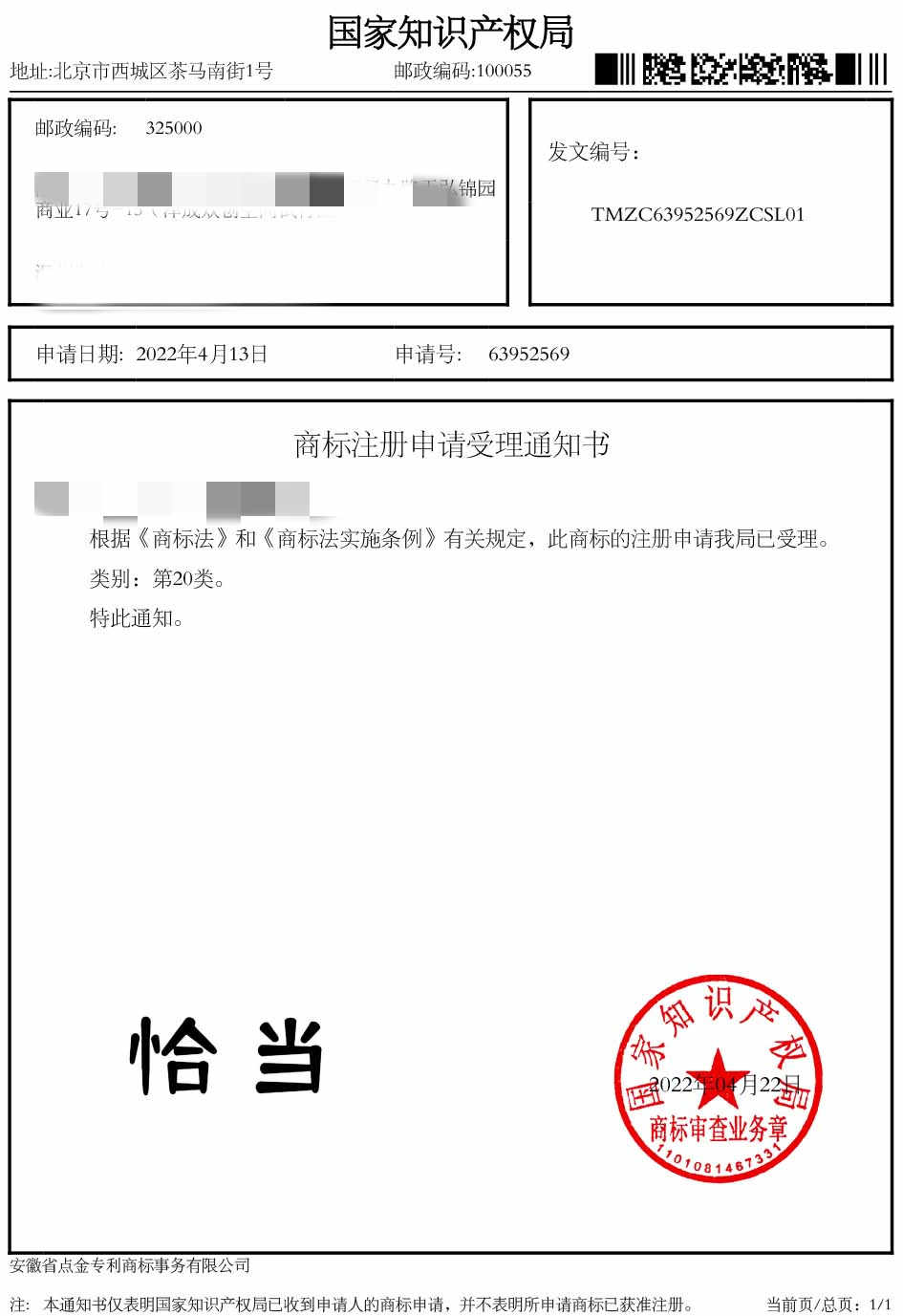 第20类“恰当”商标受理通知书