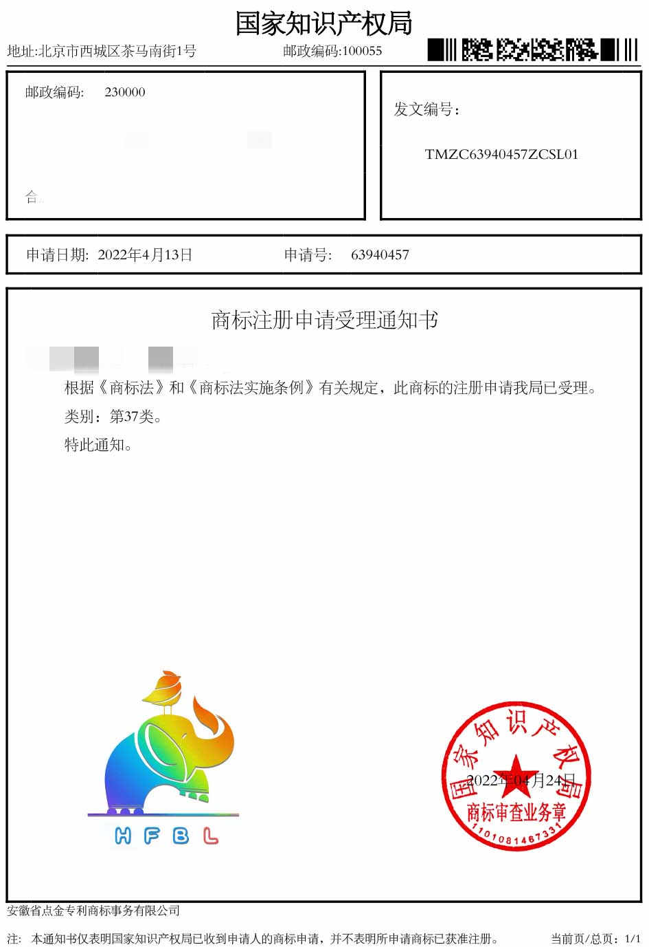 第37类“HFBL”商标受理通知书