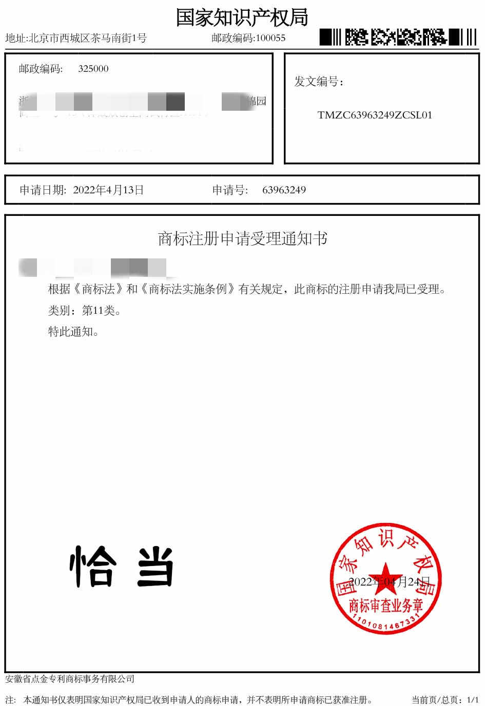 第11类“恰当”商标受理通知书