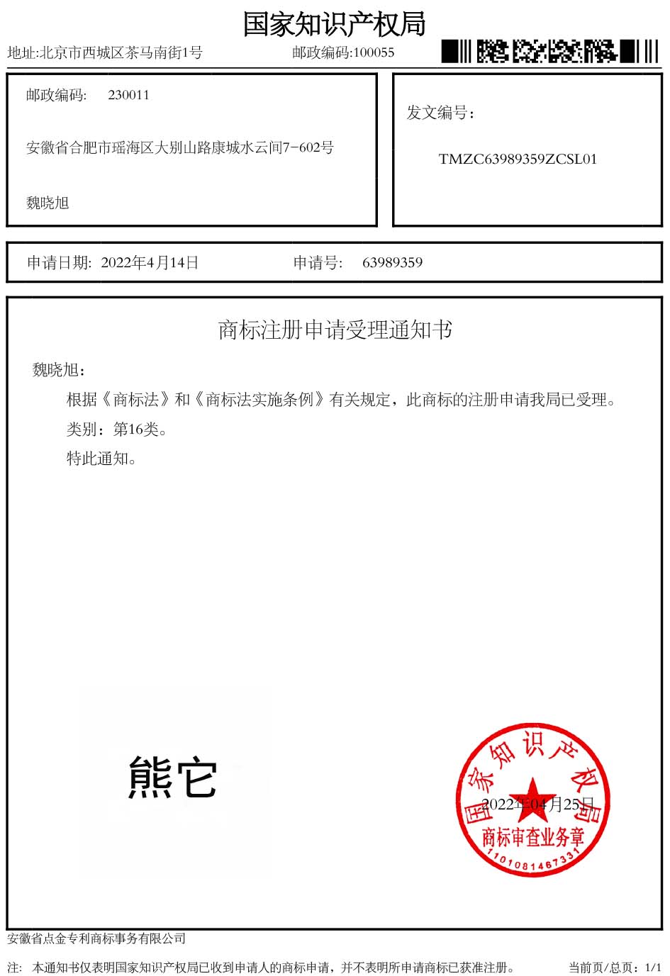 第16类“熊它”商标受理通知书