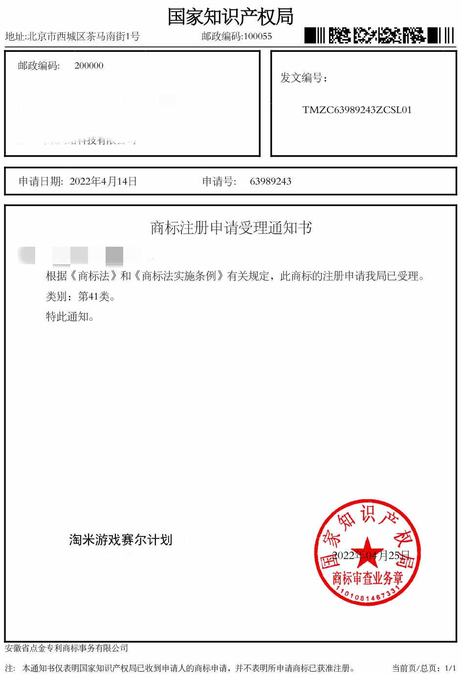 第41类“淘米游戏赛尔计划”商标受理通知书