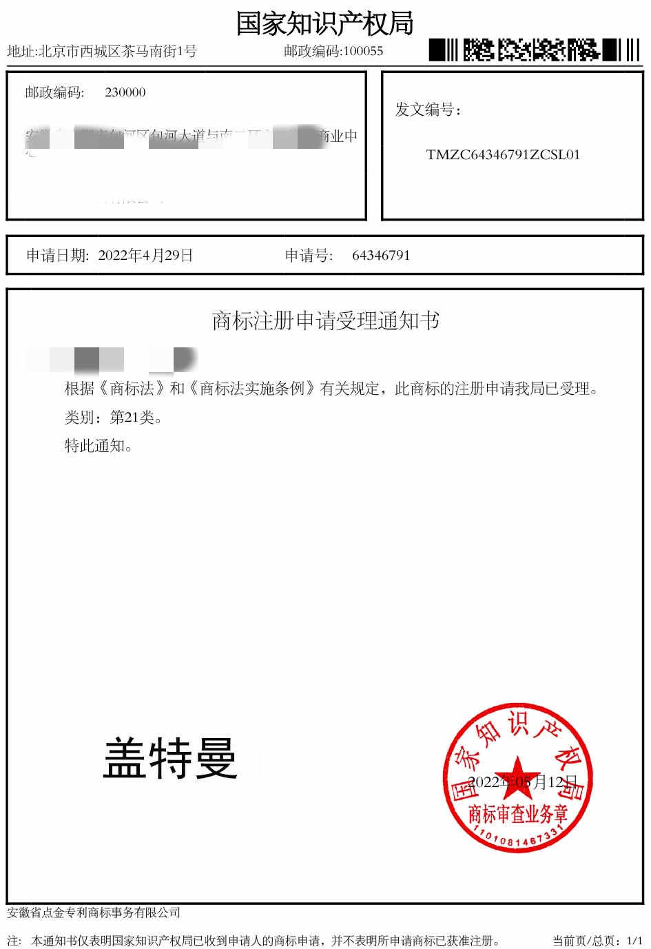 第21类“盖特曼”商标受理通知书