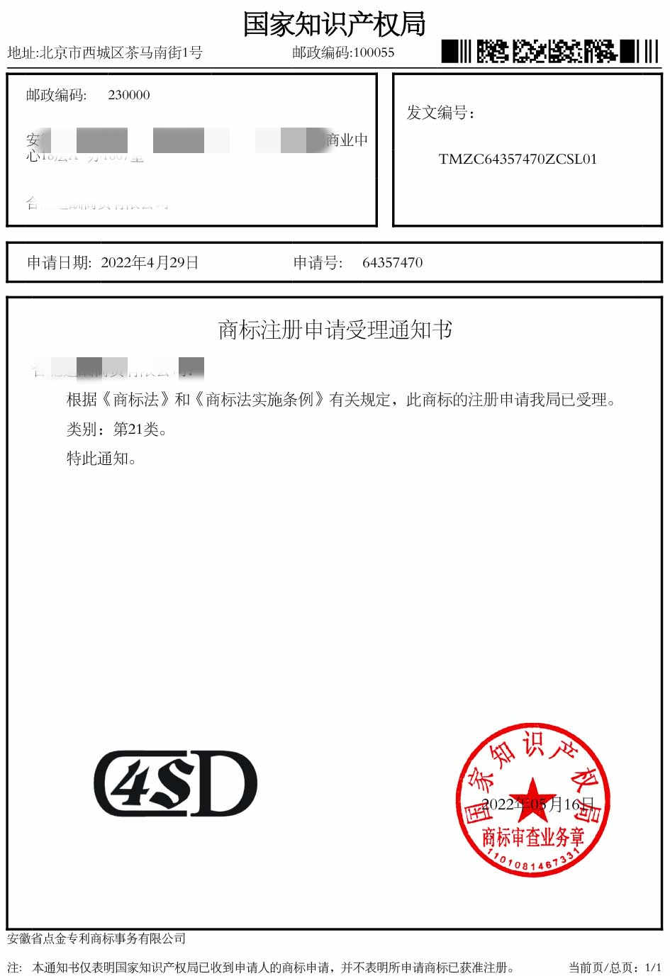 第21类“4SD”商标受理通知书