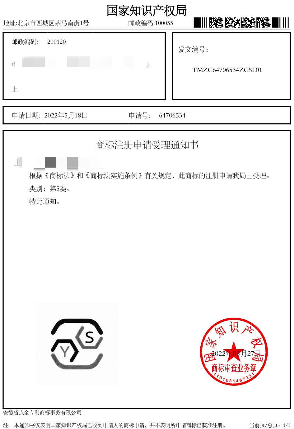 第5类“YS”商标受理通知