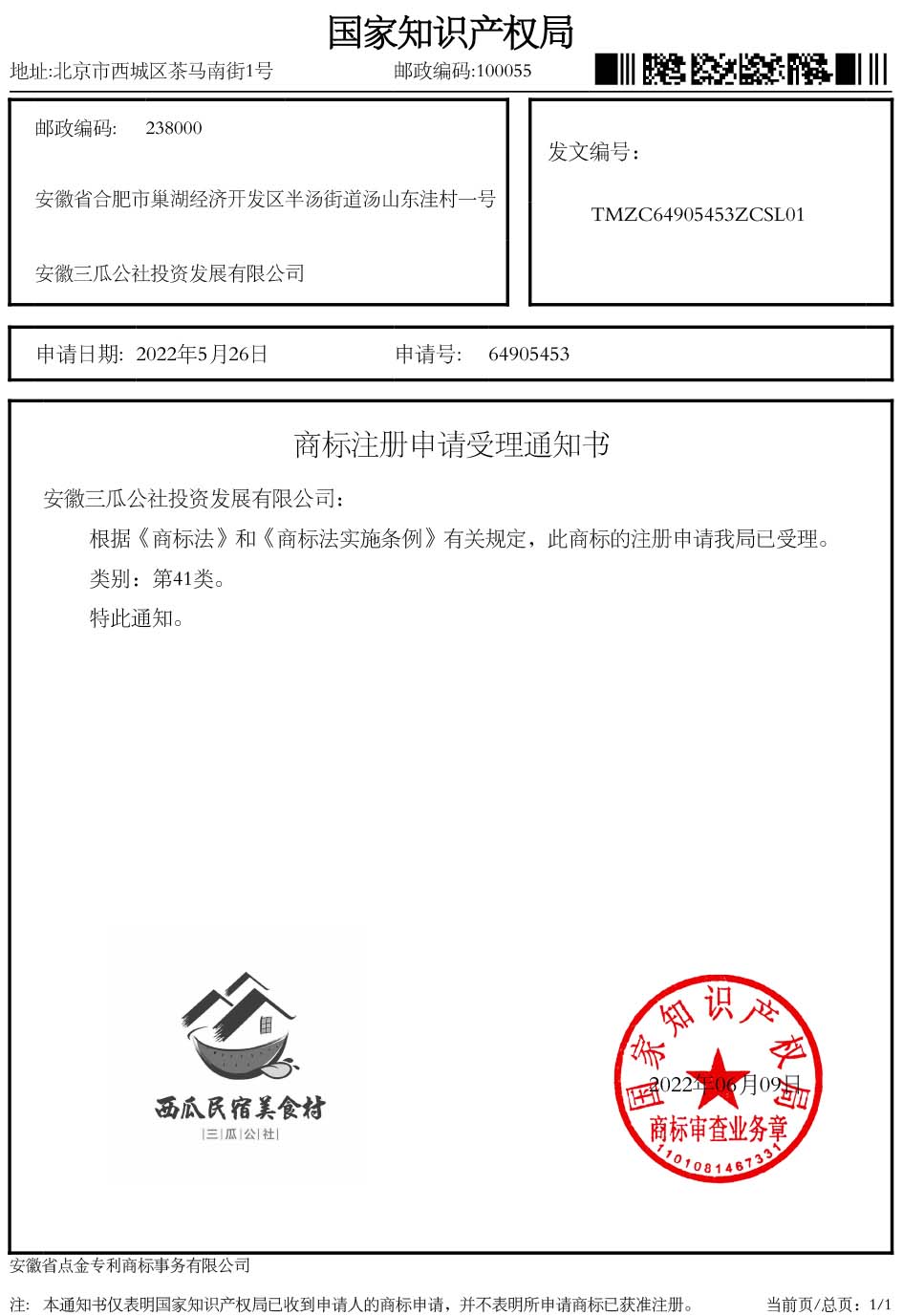 第41类“三瓜公社 西瓜民宿美食村”商标受理通知书